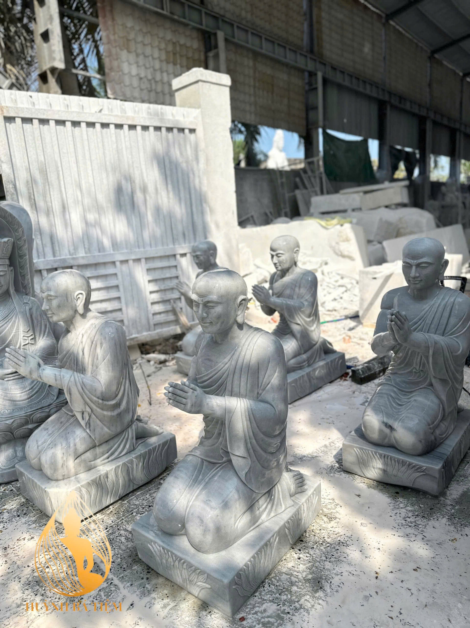 “5 anh em Kiều Trần Như” (Kaundinya và bốn người bạn đồng tu). Họ được thể hiện trong tư thế quỳ gối, chắp tay cung kính, gương mặt thể hiện sự trang nghiêm và thành tâm. Các tượng đá được chạm khắc tinh xảo, đặt trong một xưởng điêu khắc với không gian mở, thể hiện sự tôn kính và lòng thành hướng về Đức Phật – người mà họ là những đệ tử đầu tiên sau khi ngài thành đạo.